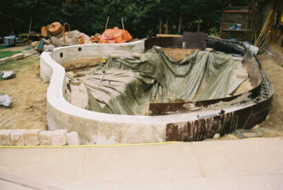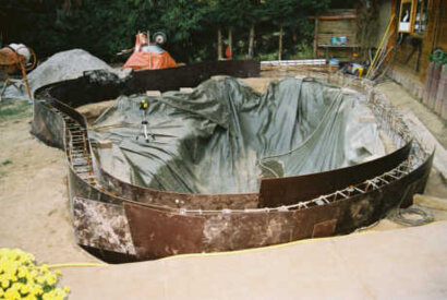 Bild 16: Stück für Stück wurde die Umrandung eingeschalt die Wasser Einläufe und Ausläufe wurden in die Schalung einbaut und mit Beton ausgegossen.