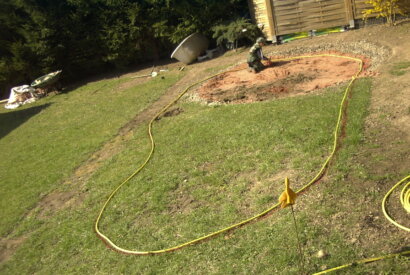 Bild 12: Nachdem wir die Umrandung komplett um den Teich gezogen haben, haben wir eine Beton Sauberkeitsschicht von 5 cm in die Umrandung eingebracht damit wenn es wieder regnet nicht der Boden von der Umrandung aufweicht. Wir haben hier Lehmboden.