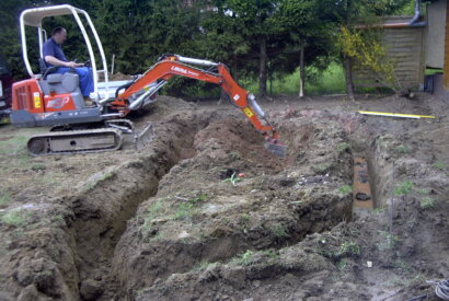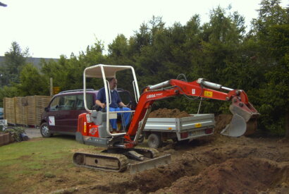Bild 4: Mit dem Minibagger geht es jetzt darum die Umrandung min.50 - 60 cm tief auszuheben und das Erdreich zu entsorgen.