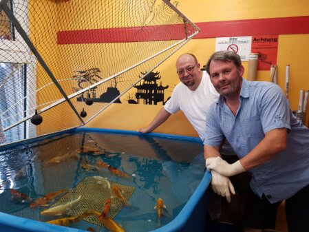 Schon seit Jahren führt Dr. Achim Bretzinger aus Lauingen fachtierarztliche Kontrollen unseres Fischbestandes durch. Bei neu importierten Koi werden Haut- und Kiemenabstriche mehreren Koi entnommen, diese Proben werden an das Tauros Diagnostik Labor geschickt, welche einen Koi Herpes Virus-Test durchführen. Ist dieser negativ und die Freigabe durch den Fischtierarzt erfolgt, werden die Fische erst nach Ablauf einer mindestens sechswöchigen Quarantäne zum Verkauf freigegeben.